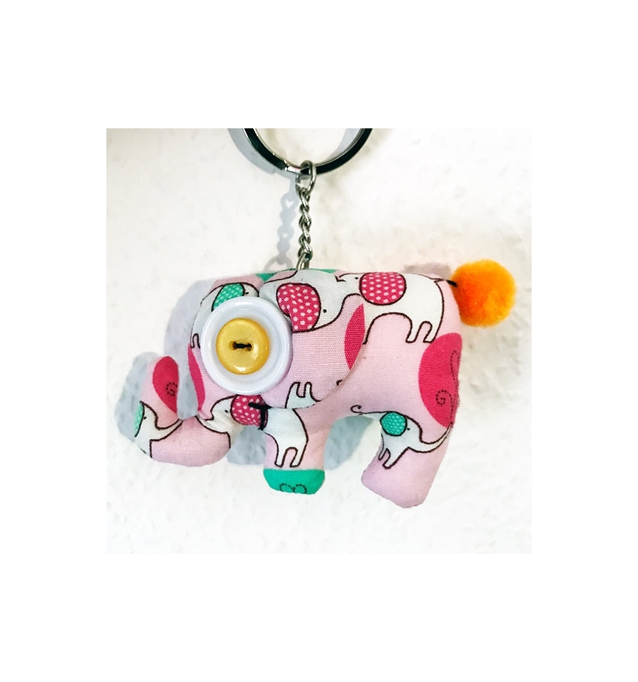 This handmade Elephant keyring is made of pink cloth and buttons.