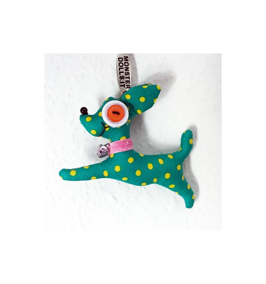 This handmade Chihuahua keyring is made of cloth, buttons and small beads that make up the necklace.