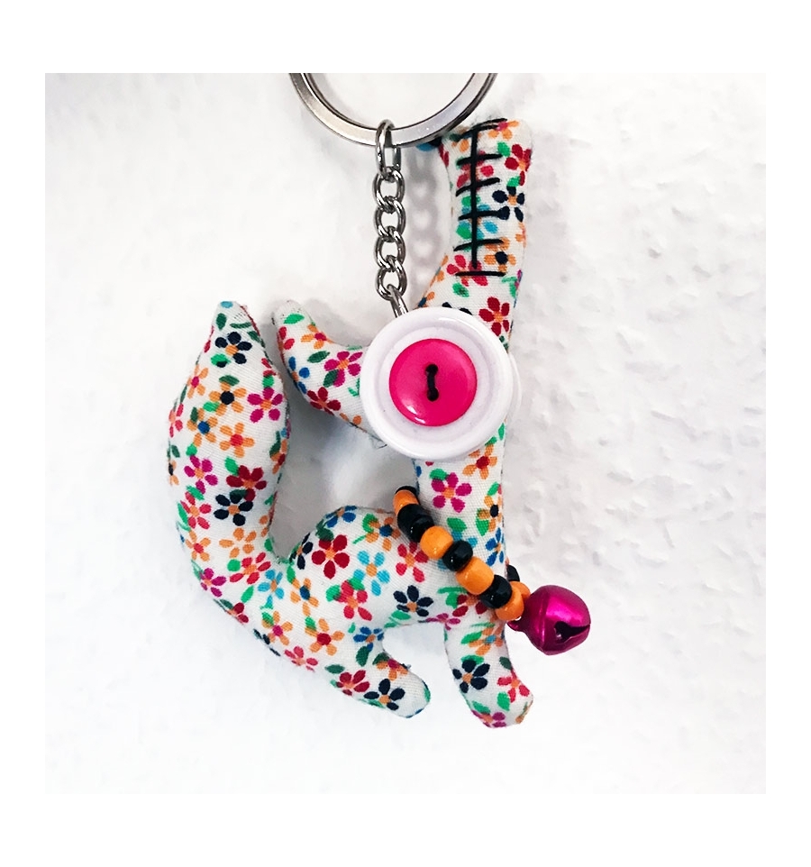 This handmade Wolf keyring is made of cloth, buttons and small beads that make up the necklace.