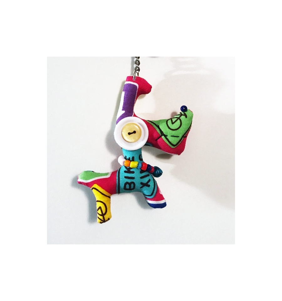 This handmade Dog keyring is made of cloth, buttons and small beads that make up the necklace.