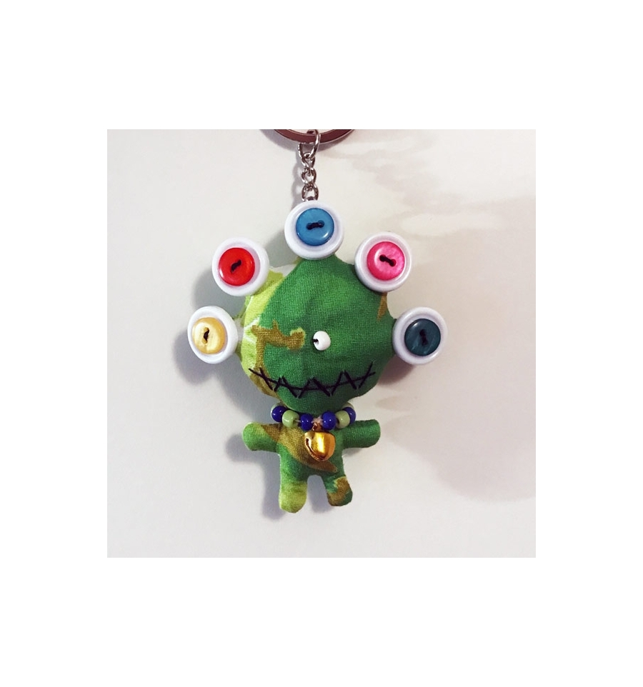 This handmade Alien keyring is made of colorful cloth and buttons.
