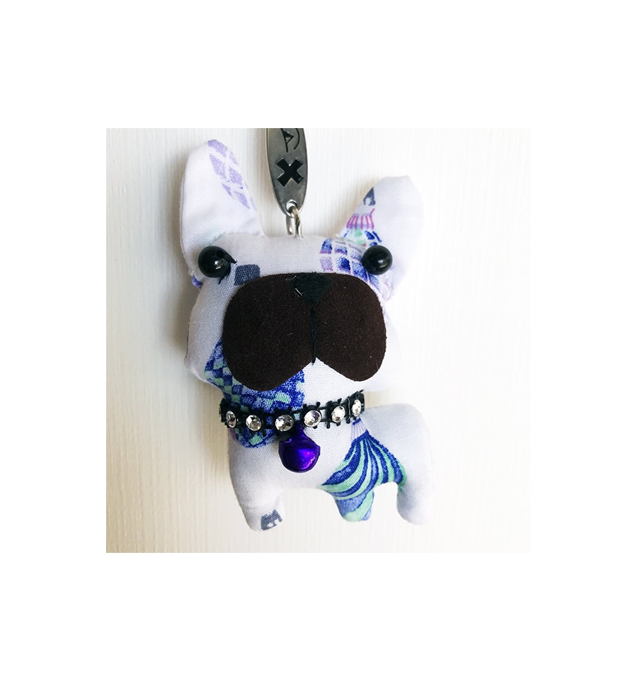 This handmade French Bulldog keyring is made of cloth, buttons and small beads that make up the necklace.