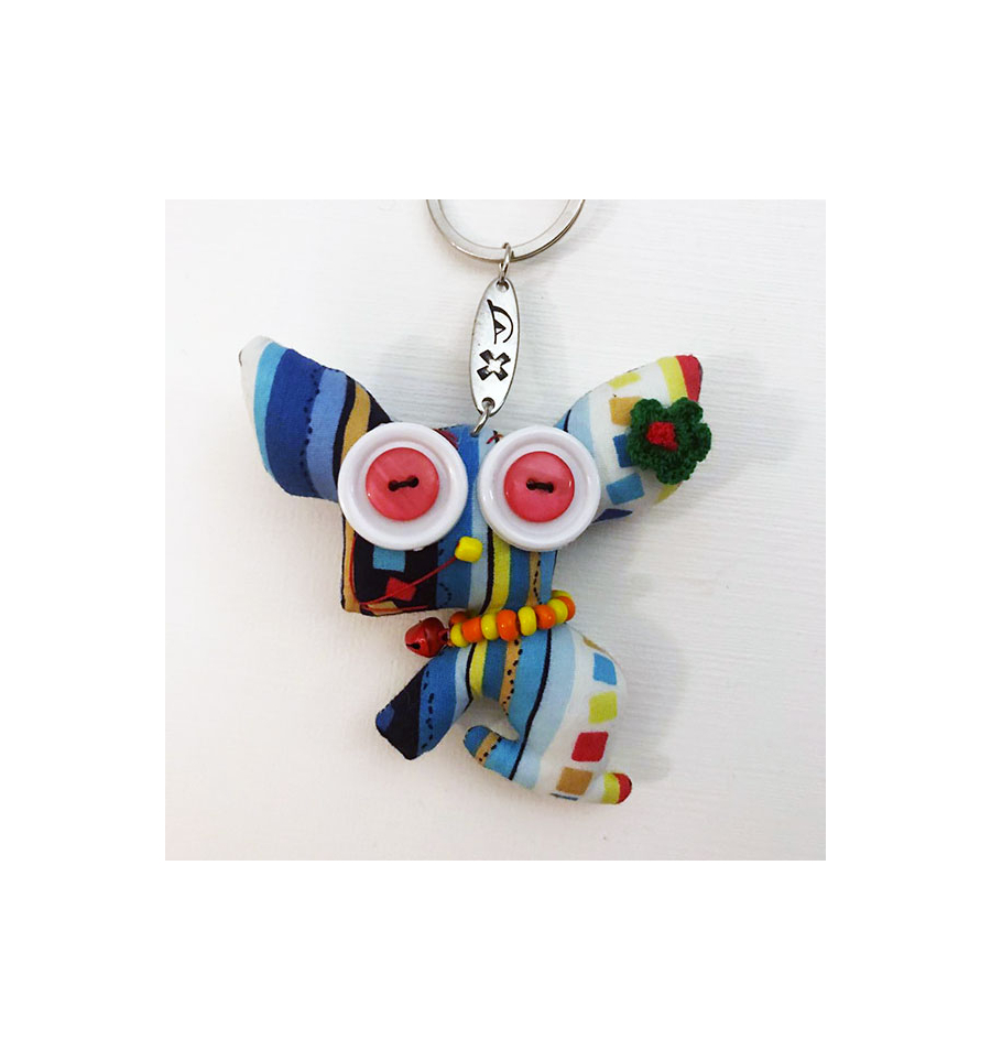 This handmade Chihuahua keyring is made of cloth, buttons and small beads that make up the necklace.