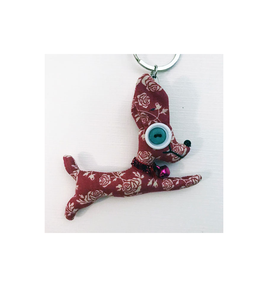 This handmade Chihuahua keyring is made of cloth, buttons and small beads that make up the necklace.
