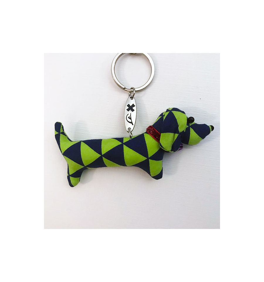 This handmade Dachshund keyring is made of cloth, buttons and small beads that make up the necklace.