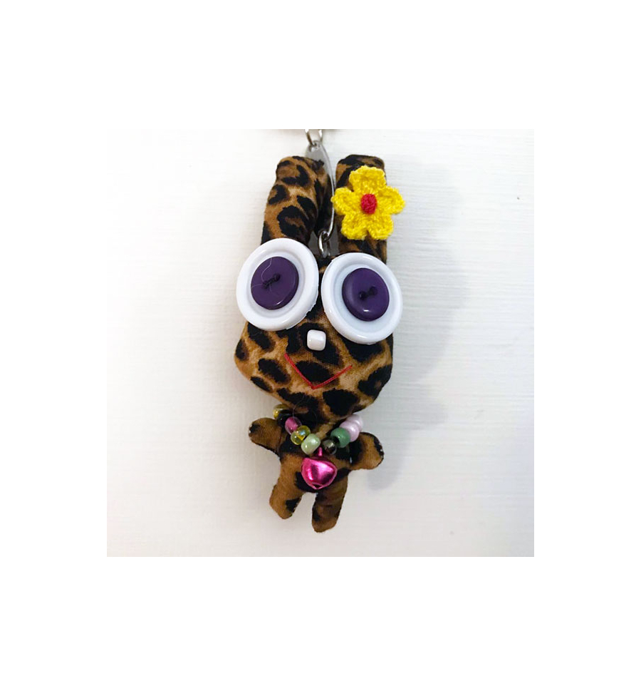 This handmade Rabbit keyring is made of cloth, buttons and small beads that make up the necklace.