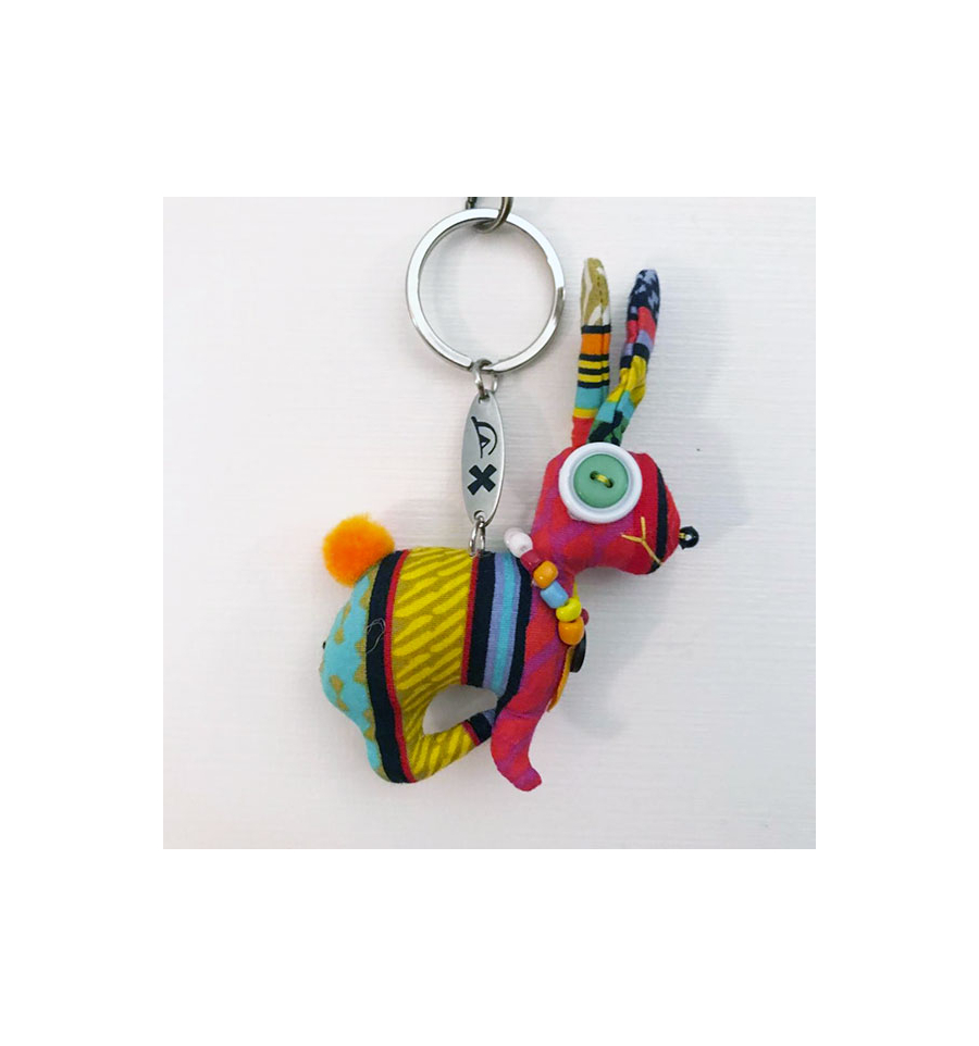 This handmade Rabbit keyring is made of cloth, buttons and small beads that make up the necklace.