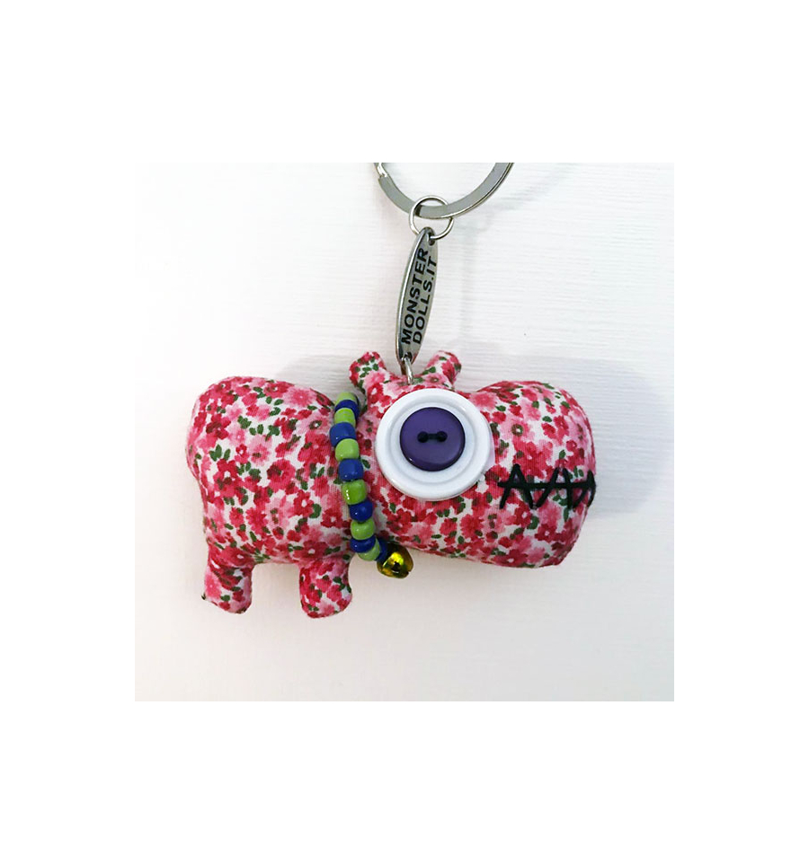 This handmade Hippo keyring is made of cloth, buttons and small beads that make up the necklace.