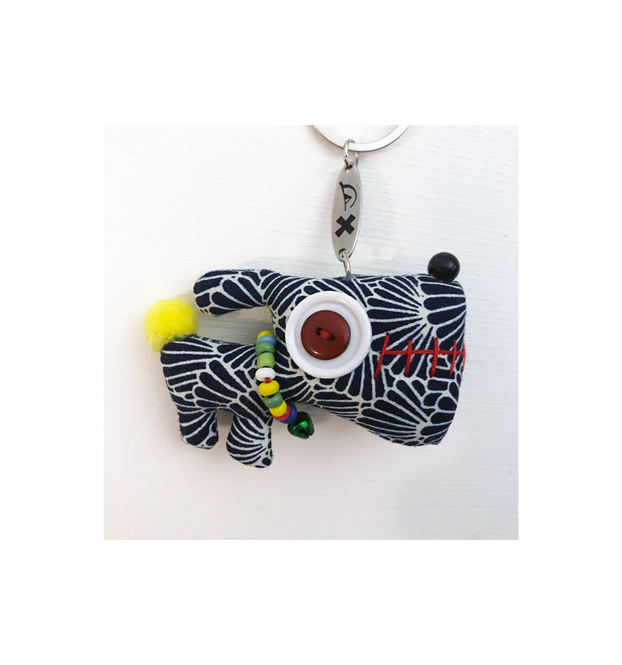 This handmade Dog keyring is made of cloth, buttons and small beads that make up the necklace.