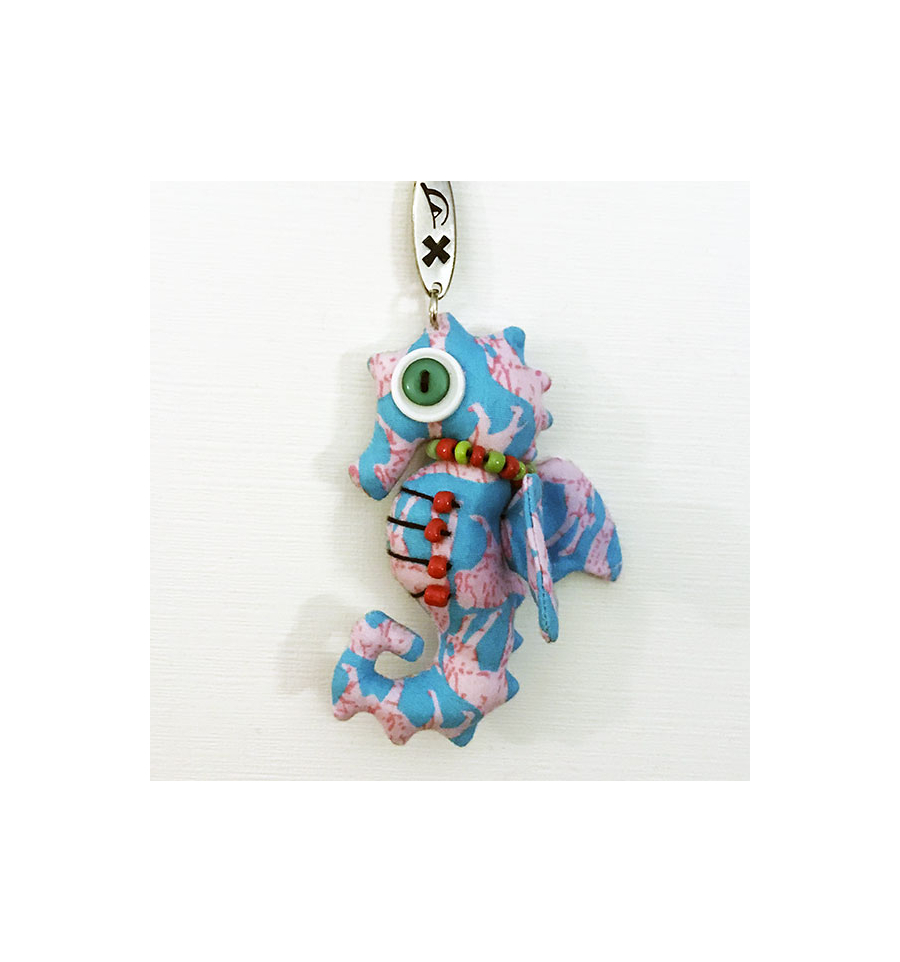 This handmade red Seahorse keyring is made of cloth, buttons and small beads that make up the necklace.