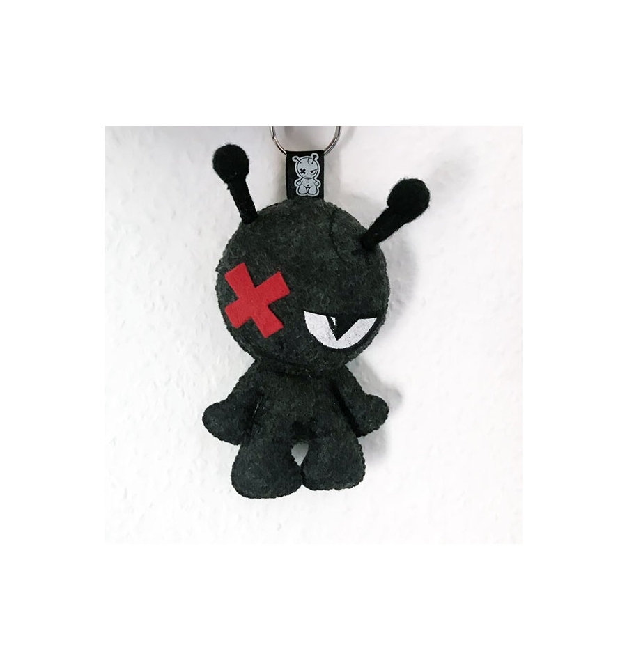 Voodoo Moodoo Black and Red Keychain with antennas (pins) on the head.