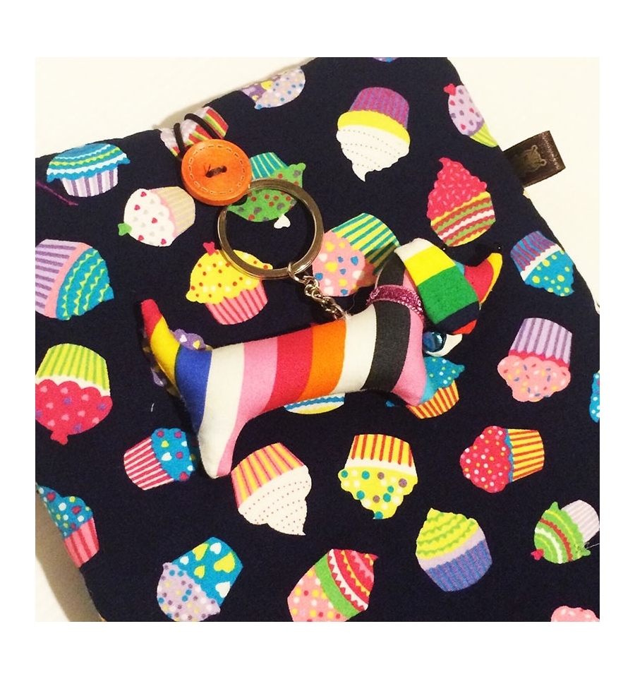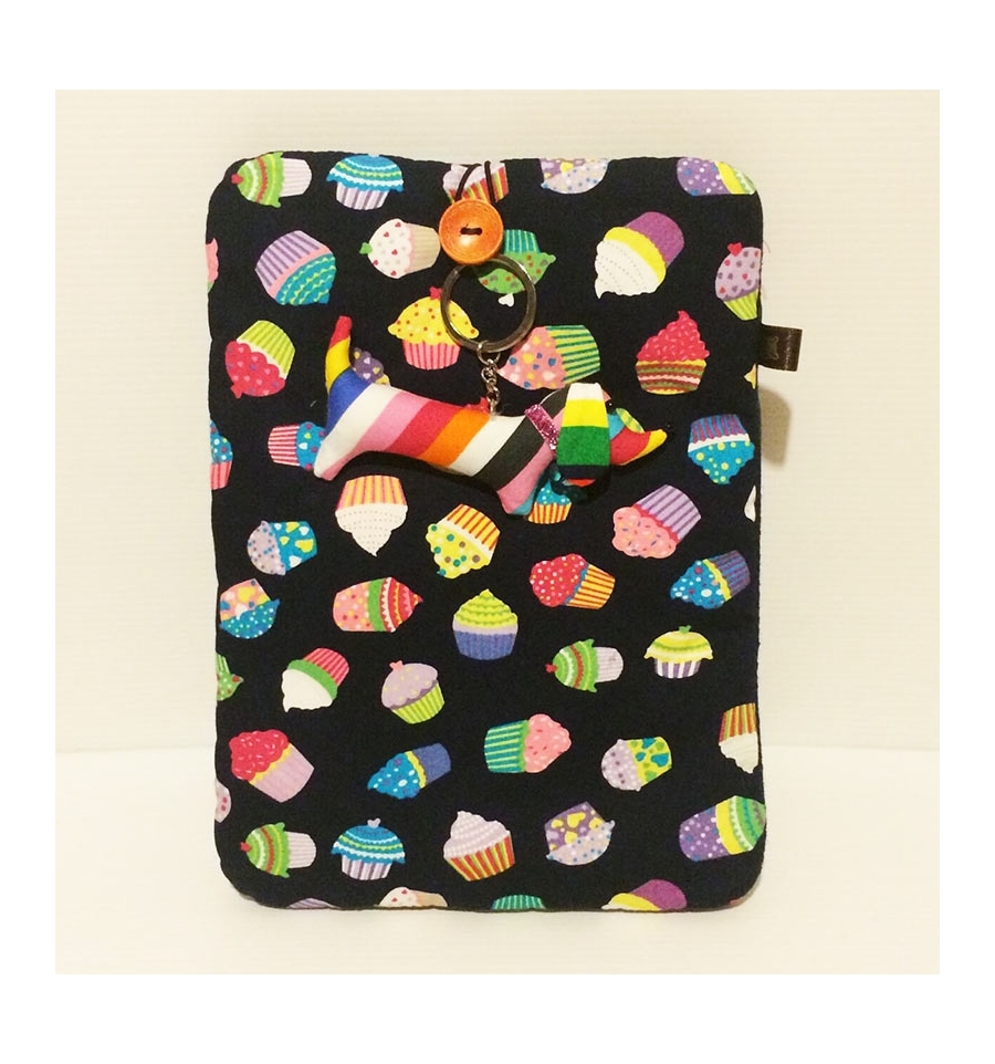Cover Mini tablet in stoffa dolcetti / muffin con ciondolino bassotto 17,5x23,5 (misure esterne).