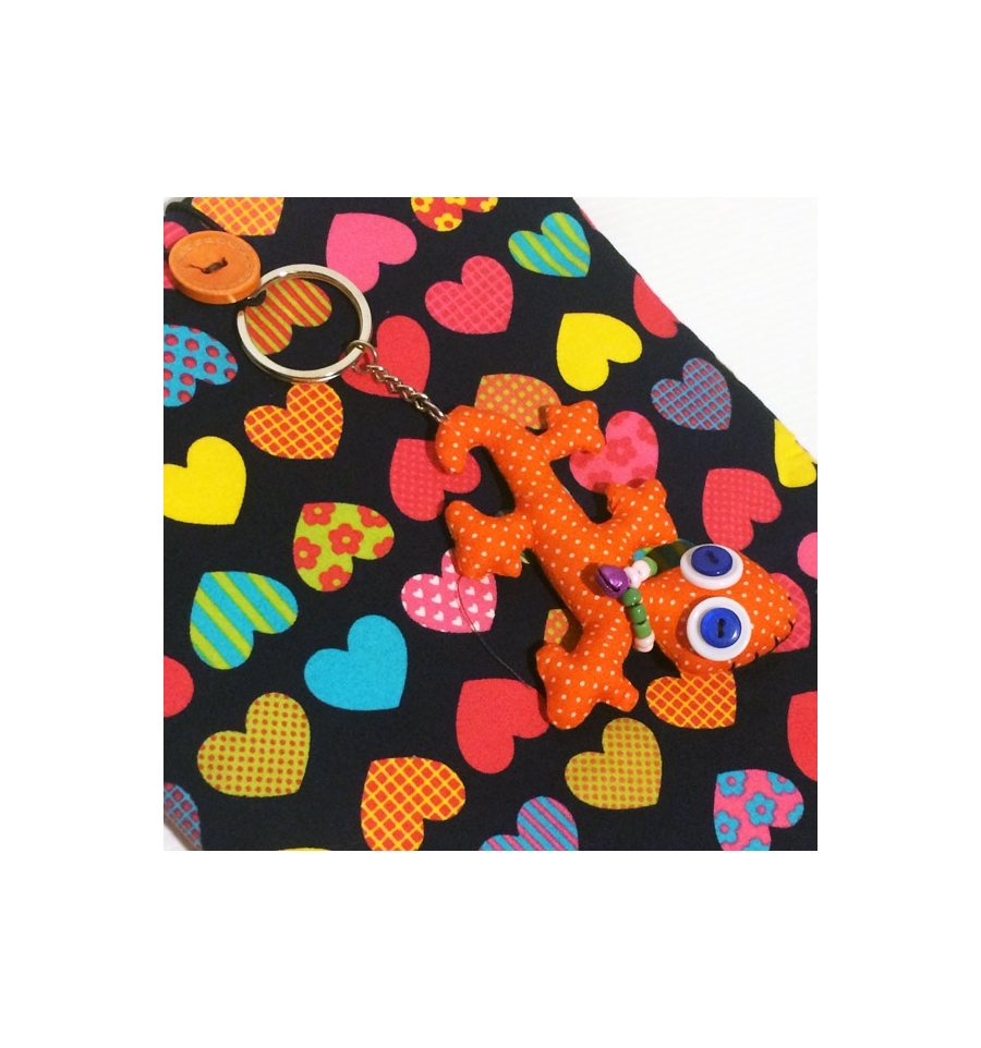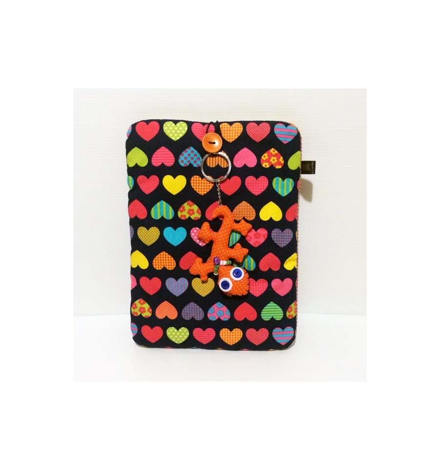 Cover Mini tablet in stoffa cuori con ciondolino geco arancione a pois 17,5x23,5 (misure esterne).