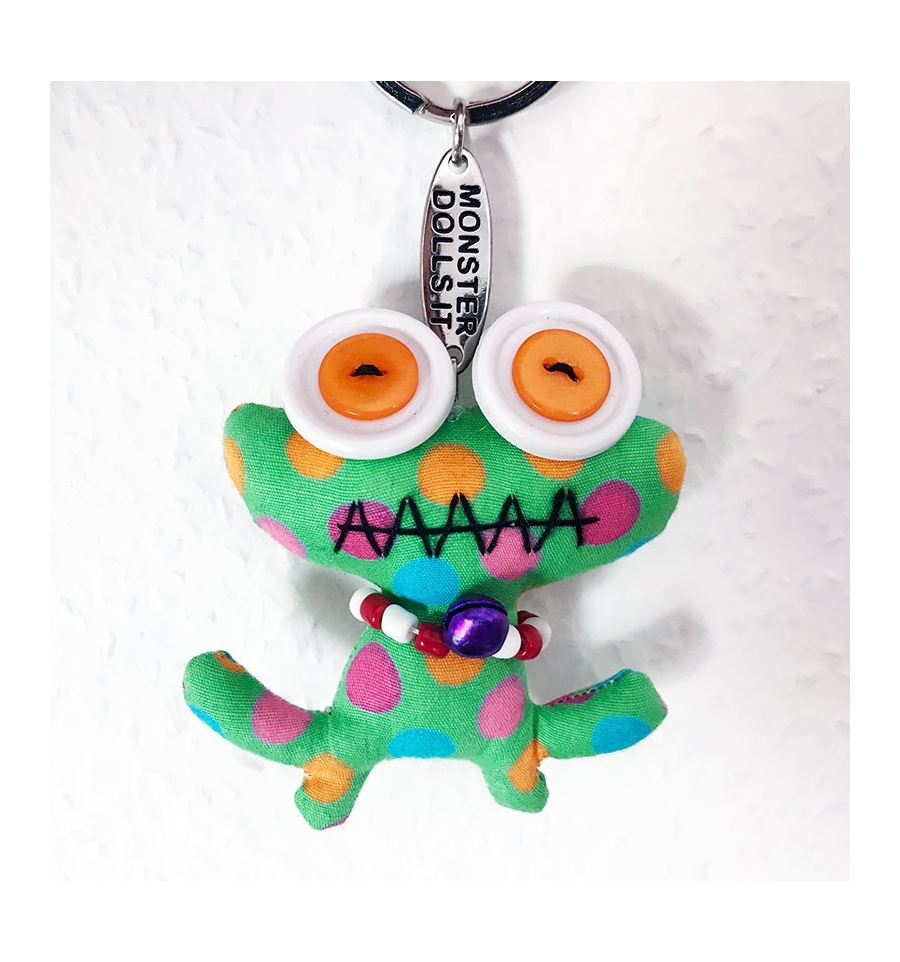 Questo portachiavi artigianale a forma di Rana è realizzato in stoffa verde, bottoni e delle piccole perline che ne compongono la collana.