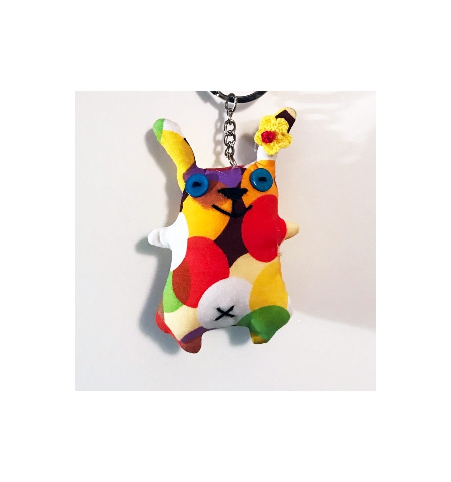 Questo portachiavi artigianale a forma di coniglio è realizzato in stoffa colorata e bottoni.
