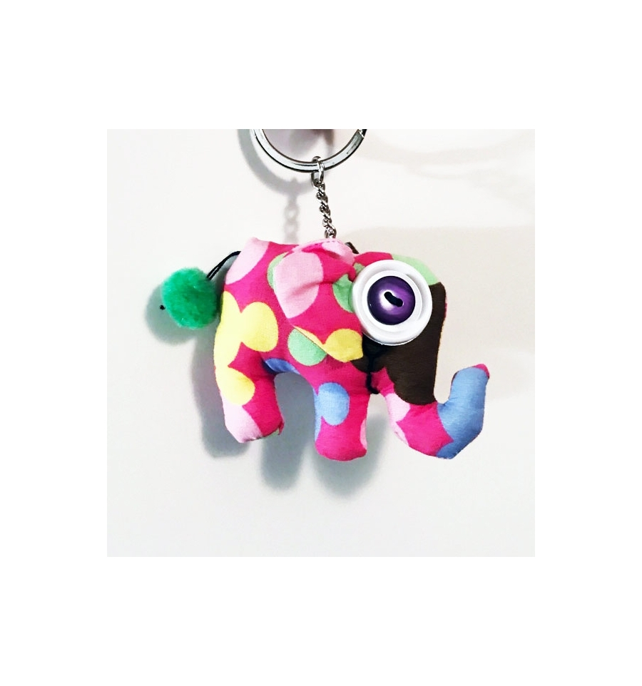Questo portachiavi artigianale a forma di elefante è realizzato in stoffa colorata e bottoni.