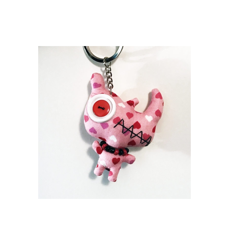 Questo portachiavi artigianale a forma di Rinoceronte è realizzato in stoffa rosa con cuori e bottoni.