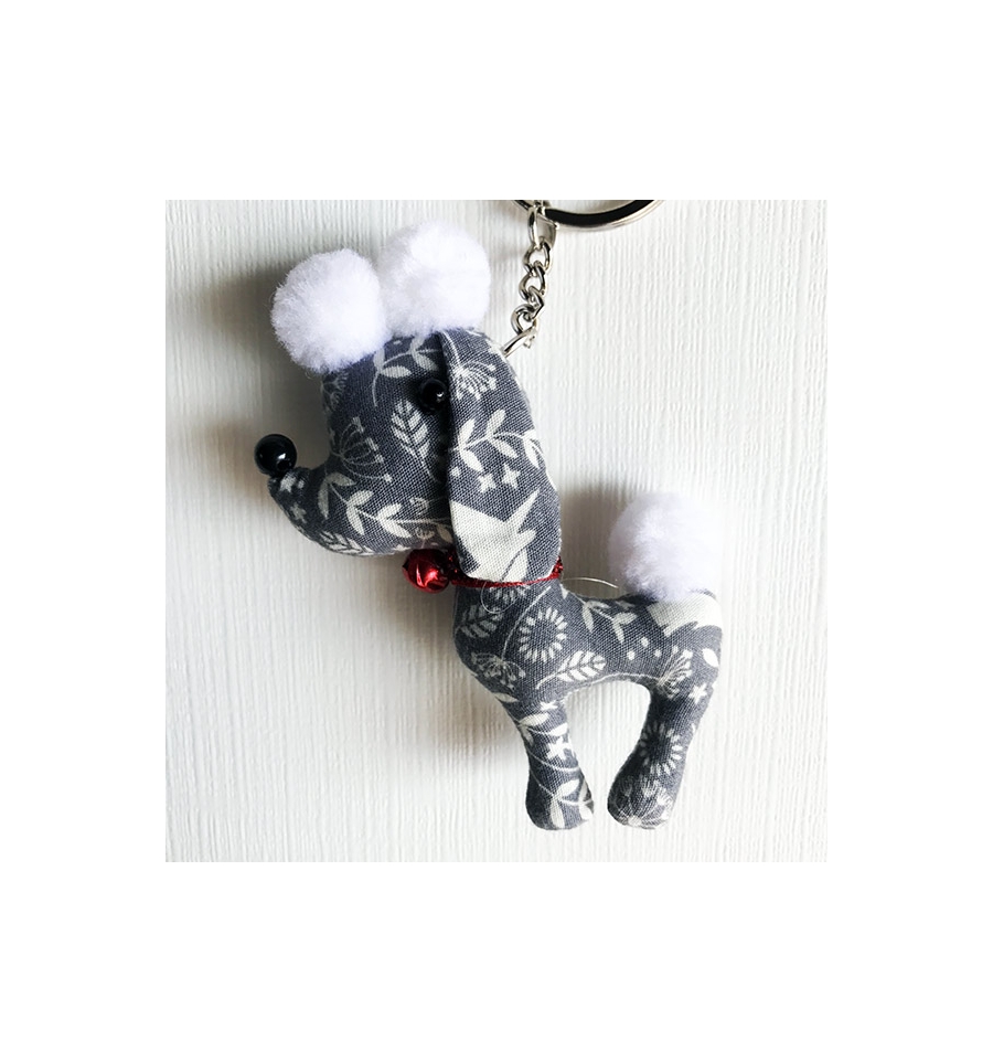 Questo portachiavi artigianale a forma di Barboncino è realizzato in stoffa colorata, bottoni e delle piccole perline che ne compongono la collana.