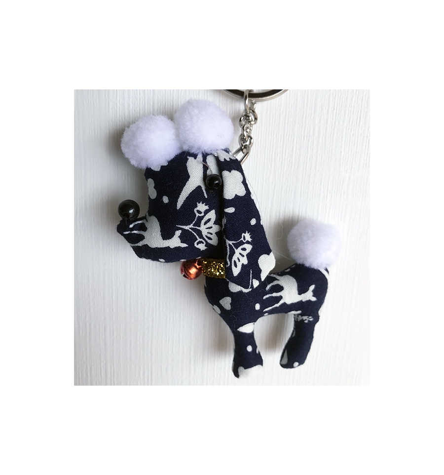 Questo portachiavi artigianale a forma di Barboncino è realizzato in stoffa blu con fiori bianchi, bottoni e delle piccole perline che ne compongono la collana.