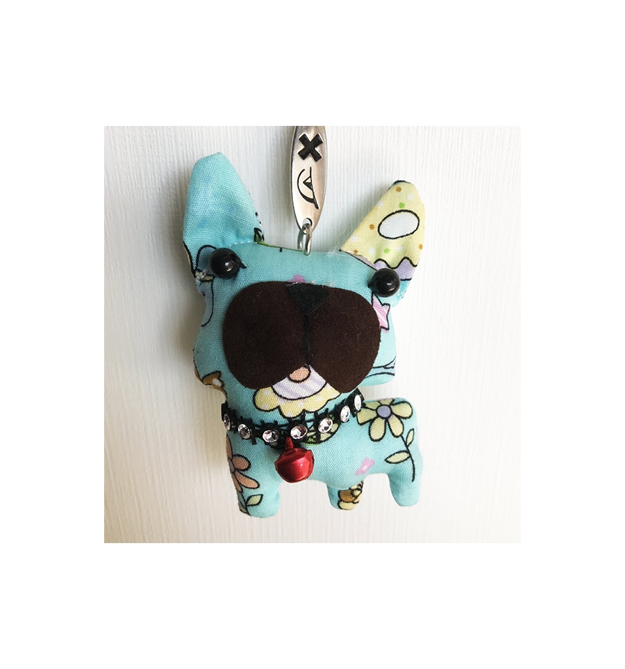 Questo portachiavi artigianale a forma di Bulldog Francese è realizzato in stoffa colorata, bottoni e delle piccole perline che ne compongono la collana.