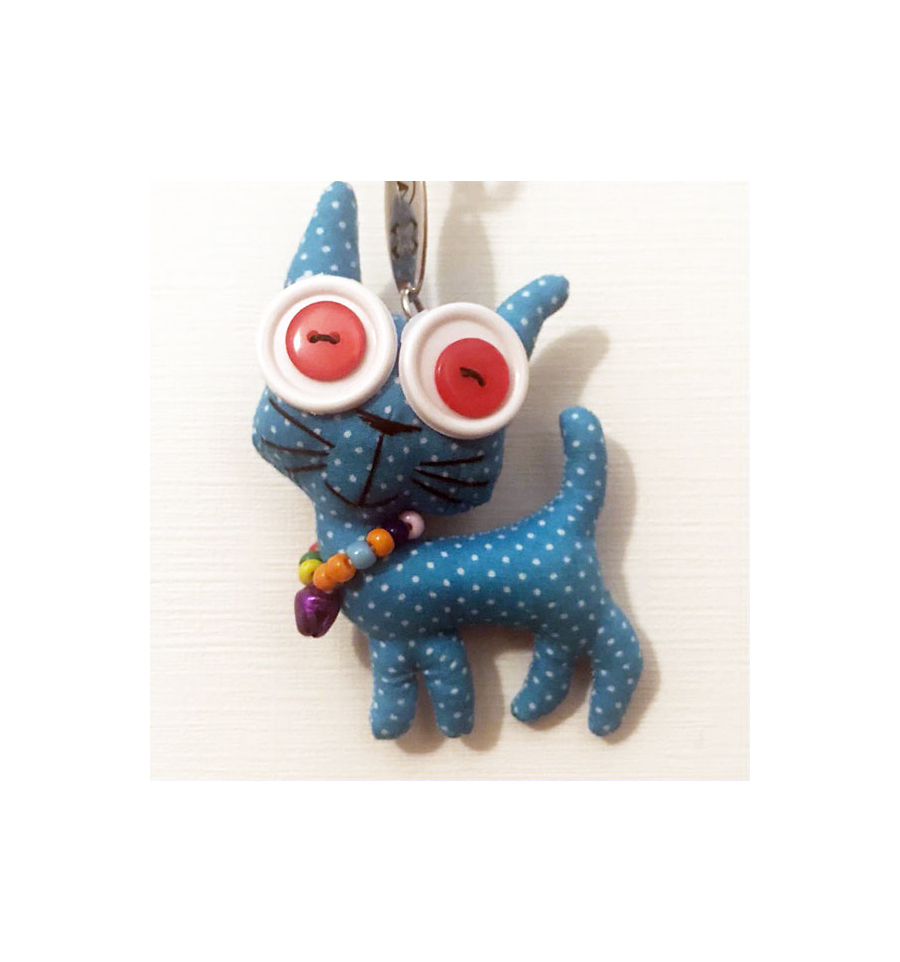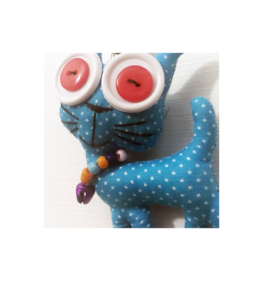 Questo portachiavi artigianale a forma di gatto è realizzato in stoffa, bottoni e delle piccole perline che ne compongono la collana.