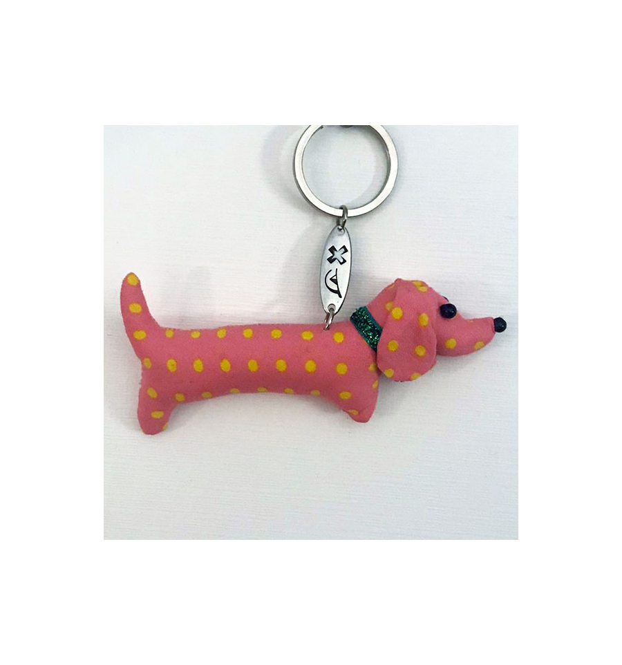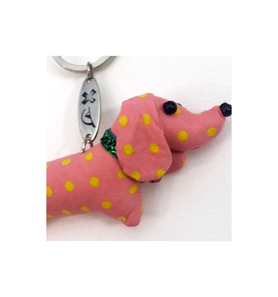 Questo portachiavi artigianale a forma di bassotto è realizzato in stoffa e bottoni.