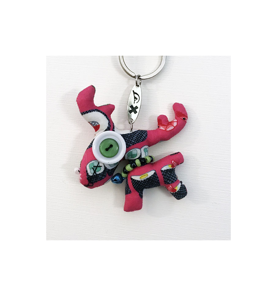 Questo portachiavi artigianale a forma di Renna è realizzato in stoffa colorata e bottoni.