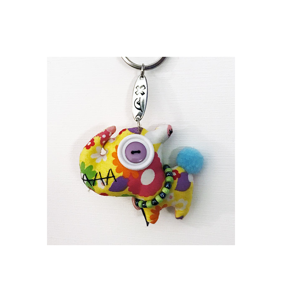 Questo portachiavi artigianale a forma di Rinoceronte è realizzato in stoffa e bottoni.